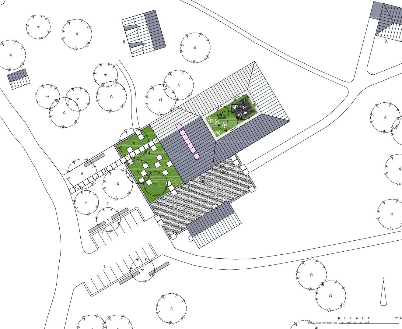 Boendet består av enkelrum med eget badrum, kompletterat med gemensamma utrymmen som matsal, bibliotek och tysta reflekterande rum.